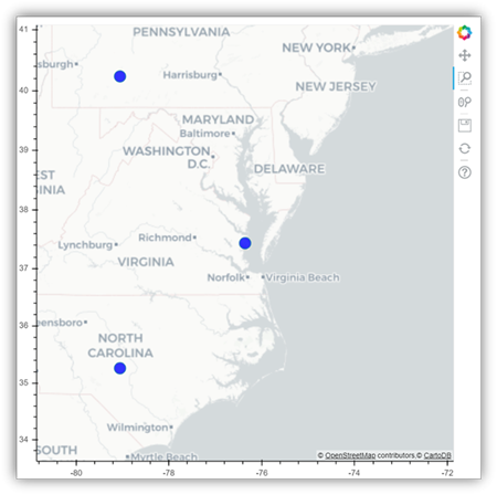 La imagen siguiente es un ejemplo del trazado de glifos en un mapa mediante bokeh.
