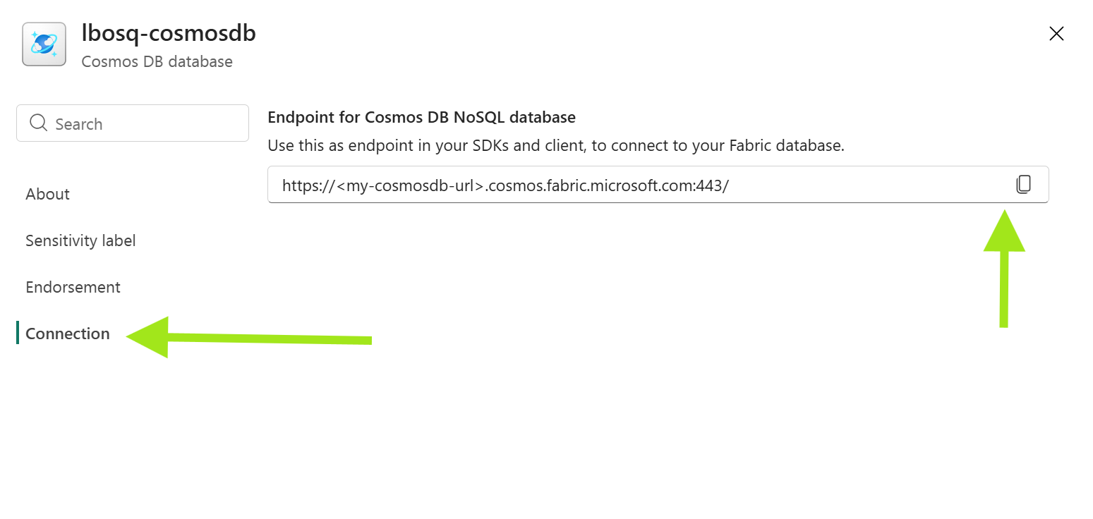 Recupere la dirección URL del punto de conexión de Fabric Cosmos DB.
