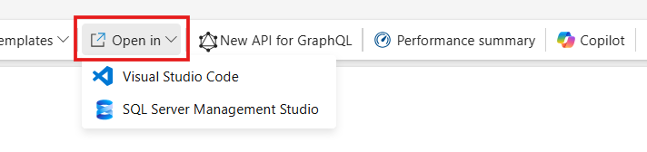 Puede conectarse fácilmente a la base de datos SQL con el botón Abrir en del editor de consultas del portal de Fabric. Elija SQL Server Management Studio o la extensión MSSQL para Visual Studio Code.