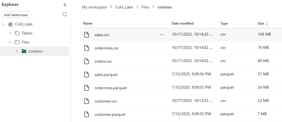 En los siguientes scripts de ejemplo se usa una instancia de Fabric Lakehouse denominada Cold_Lake que hospeda los datos de la tienda y clientes de Contoso en archivos parquet y csv.