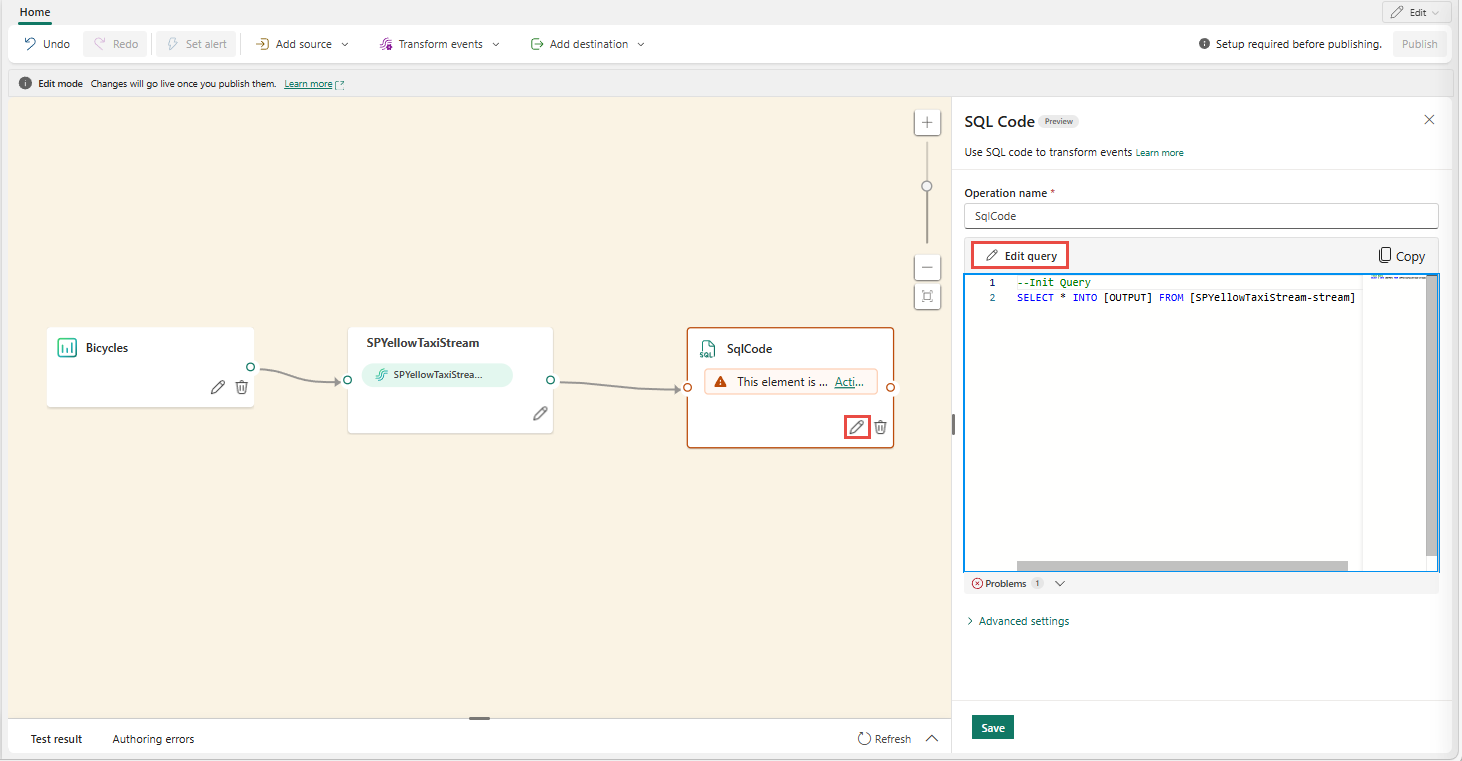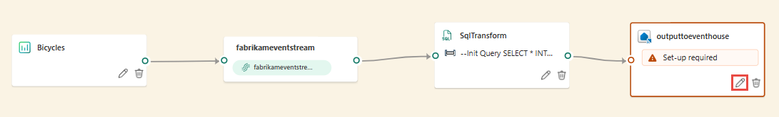 Se agrega un nuevo nodo SQL al flujo de eventos. Seleccione el icono de lápiz para continuar configurando el operador SQL.