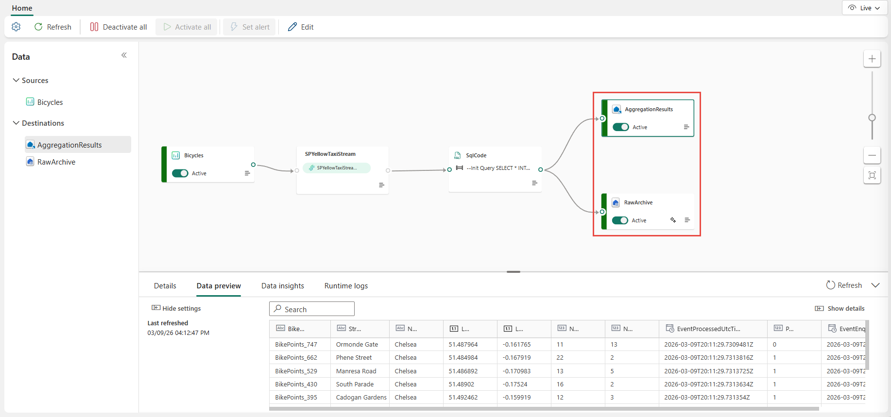 --Base query: Reading input stream once With InputStream AS( SELECT * FROM [SQLDemoES-stream] ) -- Query 1: Archive all data to Lakehouse SELECT * INTO [RawArchive] FROM InputStream -- Query 2: Aggregate and filter data to create a real time dashboard to an Eventhouse SELECT System.Timestamp() AS EventTime, COUNT(*) AS EventCount INTO [AggregationResults] FROM InputStream GROUP BY TumblingWindow(minute, 1) HAVING COUNT(*) > 100Seleccione Test query (Probar consulta ) para validar el resultado de la consulta. Cada salida definida en la consulta tiene una pestaña independiente en el panel Resultados de la prueba .