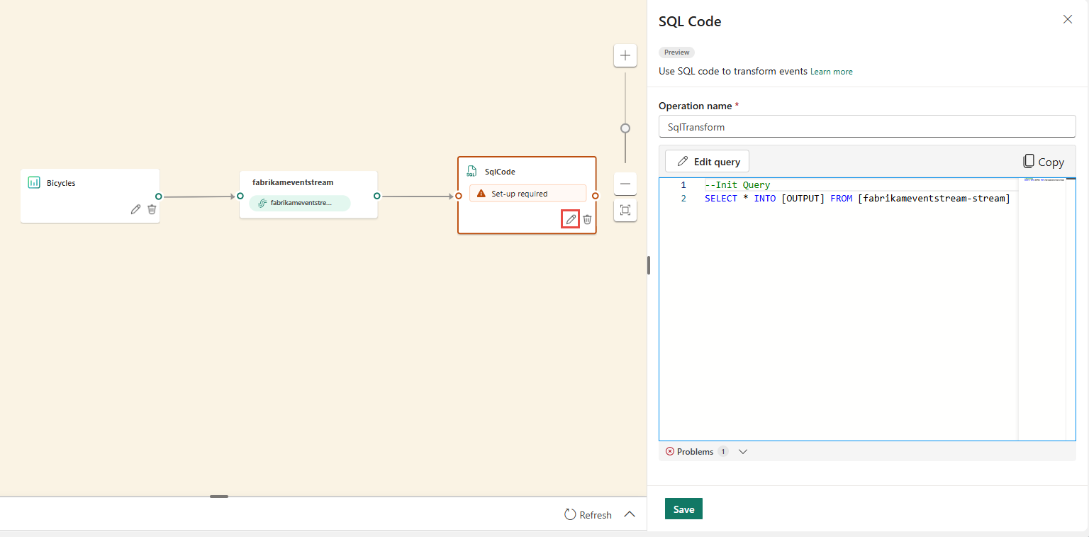 Seleccione Editar (icono de lápiz) en el nodo operador SQL para abrir el panel Código SQL .