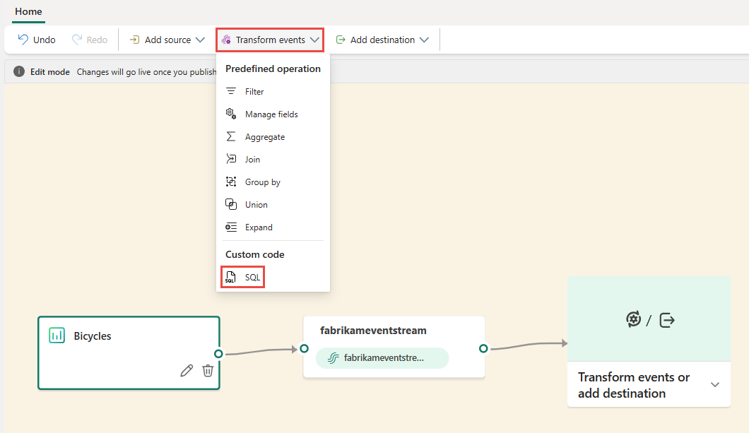 Un operador SQL (versión preliminar), también denominado editor de código SQL, es una nueva funcionalidad de transformación de datos en las secuencias de eventos de Microsoft Fabric. Los operadores SQL proporcionan una experiencia de edición de código donde puede definir fácilmente su propia lógica de transformación de datos personalizada mediante expresiones SQL simples. En este artículo se describe cómo usar un operador SQL para transformaciones de datos en una secuencia de eventos.