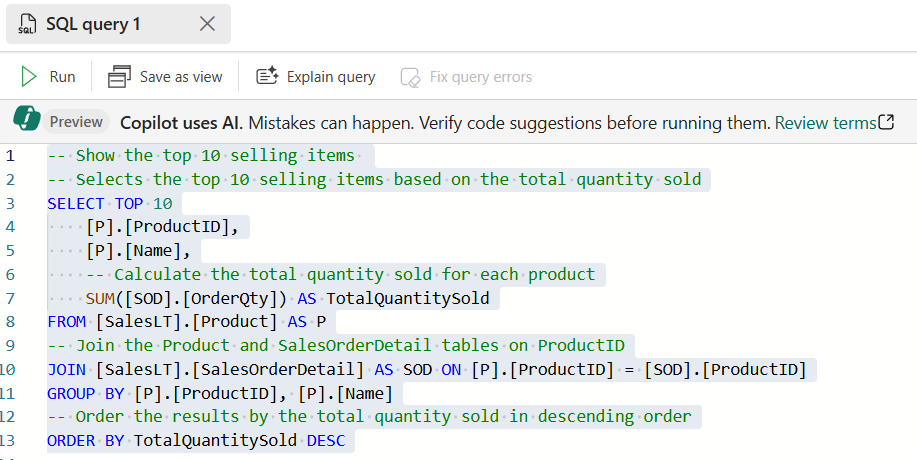 TOP 10kyselyn ja luo näkymän yksinkertaisen analyyttisen T-SQL-kyselyn perusteella. Uutta näkymääSupplyChain.vProductsbySupplierskäytetään myöhemmin tässä opetusohjelmassa.-- Show the top 10 selling items SELECT TOP 10 [P].[ProductID], [P].[Name], SUM([SOD].[OrderQty]) AS TotalQuantitySold FROM [SalesLT].[Product] AS P INNER JOIN [SalesLT].[SalesOrderDetail] AS SOD ON [P].[ProductID] = [SOD].[ProductID] GROUP BY [P].[ProductID], [P].[Name] ORDER BY TotalQuantitySold DESC; GO /* Create View that will be used in the SQL GraphQL Endpoint */ CREATE VIEW SupplyChain.vProductsbySuppliers AS SELECT COUNT(a.ProductID) AS ProductCount , a.SupplierLocationID , b.CompanyName FROM SupplyChain.Warehouse AS a INNER JOIN dbo.Suppliers AS b ON a.SupplierID = b.SupplierID GROUP BY a.SupplierLocationID, b.CompanyName; GOSuorita T-SQL-kysely valitsemalla työkalurivin Suorita-painike .