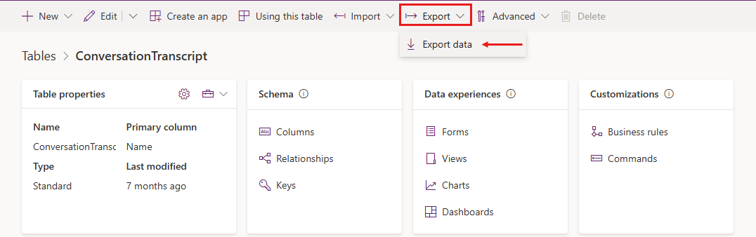 Keskustelun transkriptio on olemassa Dataverse-taulukkona, jonka voi ladata CSV-tiedostona (pilkulla erotellut arvot). Logiikka, joka määrittää, milloin ja miten järjestelmä tallentaa tiedot keskustelun transkripteihin, on: