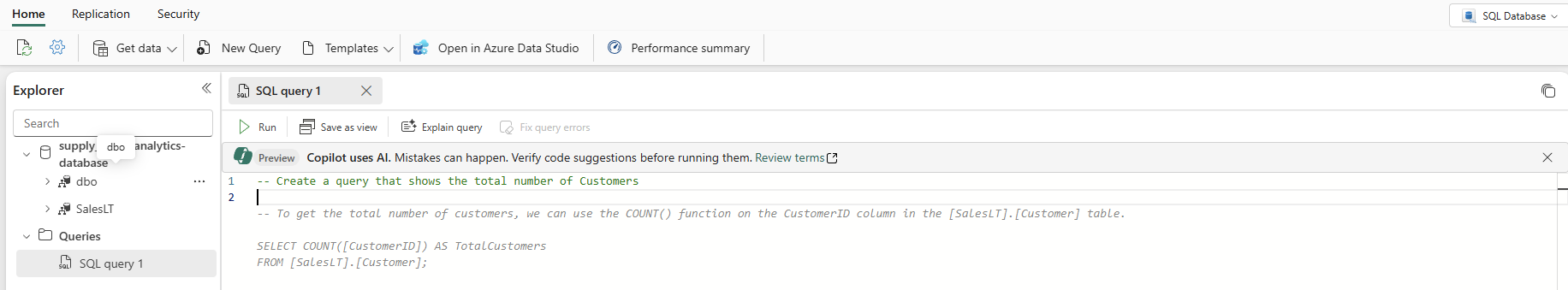 Dans un environnement de production, vous pouvez avoir des données déjà dans un format normalisé pour les opérations d’application quotidiennes, que vous avez simulées ici avec les données SalesLT . Lorsque vous créez une requête, elle est enregistrée automatiquement dans l’élément Requêtes dans le volet Explorateur . Vous devez voir votre requête comme « REQUÊTE SQL 1 ». Par défaut, le système numérote les requêtes comme « Requête SQL 1 », mais vous pouvez sélectionner les points de suspension en regard du nom de la requête pour dupliquer, renommer ou supprimer la requête.