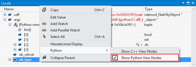 Lorsqu’une trame native (C ou C++) est active, ses variables locales s’affichent dans la fenêtre Locals du débogueur. Dans les modules d’extension Python natifs, la plupart de ces variables sont de type PyObject (qui est un typedef pour _object), ou quelques autres types Python fondamentaux. Dans le débogage en mode mixte, ces valeurs présentent un autre nœud enfant étiqueté [vue Python].