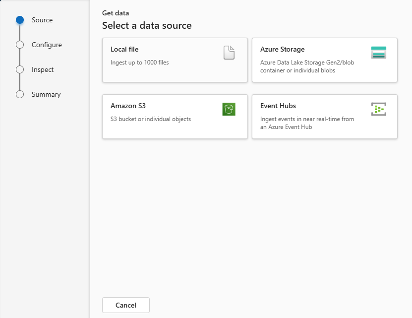 Selezionare l'origine dati dall'elenco disponibile. In questo esempio si inseriscono dati da un file locale.