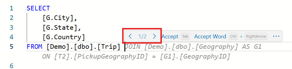 Quando si inizia a scrivere codice o commenti T-SQL nell'editor, Copilot nel database SQL di Fabric utilizza lo schema del database e il contesto della scheda query per fornire suggerimenti di codice inline, integrando l'IntelliSense esistente.