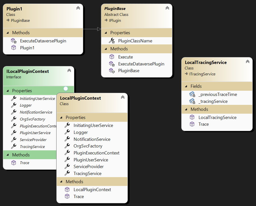 The example Plugin1 class (in the diagram) derives from PluginBase. You would rename this Plugin1 class to your own custom name and add code to implement the ExecuteDataversePlugin method and class constructor. The LocalPluginContext class is automatically initialized with the indicated service references and endpoints available to your plug-in. If you were implementing the IPlugin interface, you would have to write code to initialize all these services and endpoints prior to using them.