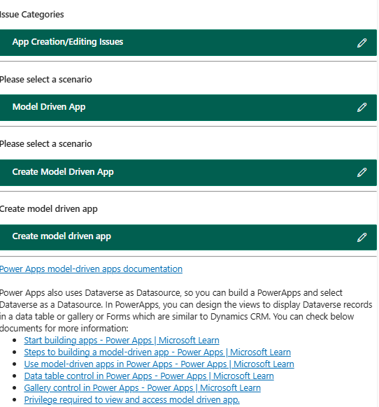 Le finestre di dialogo per la risoluzione dei problemi sono progettate per guidare l'utente verso una soluzione se le risposte generative non risolvono il problema. Queste finestre di dialogo vengono spesso attivate se si verifica un livello di ambiguità sul problema. Per procedere in molti casi, è necessario spostarsi tra queste finestre di dialogo e una soluzione. Queste finestre di dialogo vengono create dai team di prodotto per rappresentare problemi frequenti, domande e altri argomenti illustrati nelle richieste di supporto precedenti. Passando alla finestra di dialogo, è possibile trovare le risposte e aiutare Microsoft a classificare il problema, in modo che qualsiasi richiesta di supporto venga indirizzata al rappresentante del supporto Tecnico Microsoft corretto e che il team di progettazione del prodotto proprietario venga avvisato.