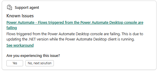 L'agente di supporto fornisce soluzioni basate su un riepilogo delle risposte di descrizione e colloquio. L'agente controlla gli avvisi di integrità del servizio per il prodotto selezionato, cerca i problemi noti, genera risposte dalla documentazione e dal contenuto della community e può attivare una finestra di dialogo per la risoluzione dei problemi. Esaminare il contenuto e seguire le istruzioni per passare attraverso le soluzioni.È importante notare che il contenuto generato dall'intelligenza artificiale potrebbe non essere corretto.