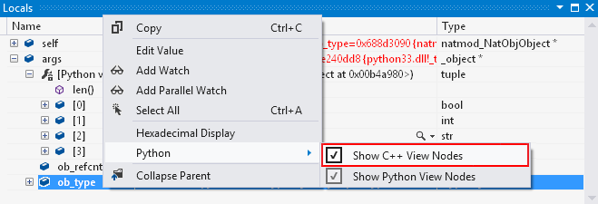 Per abilitare la funzionalità, fare clic con il pulsante destro del mouse nella finestra Variabili locali e impostare l'opzione> di menuPython Show C++ View Nodes (Mostra nodi visualizzazione C++).
