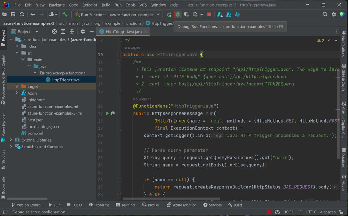 src/main/java/org/example/functions/HttpTriggerJava.java に移動して生成されたコードを確認します。 17 行目の横に、緑色の [実行] ボタンが表示されるはずです。 それを選択し、['Functions-azur...' の実行] を選択します。 関数アプリがローカルで実行され、いくつかのログが表示されます。