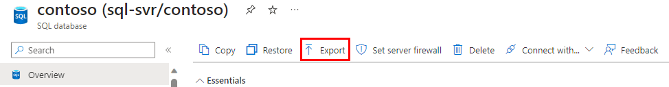 Azure ポータル を使用してデータベースをエクスポートするには、データベースのページを開き、ツール バーの Export を選択します。