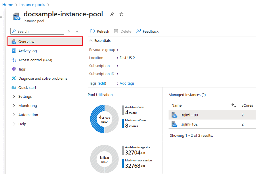 プール内のイタリアのリストを取得するには、Azure Portal を使用して、[インスタンス プール] ページを確認します。 プール名を選択して、[概要] ページのプール内のインスタンスを表示します。