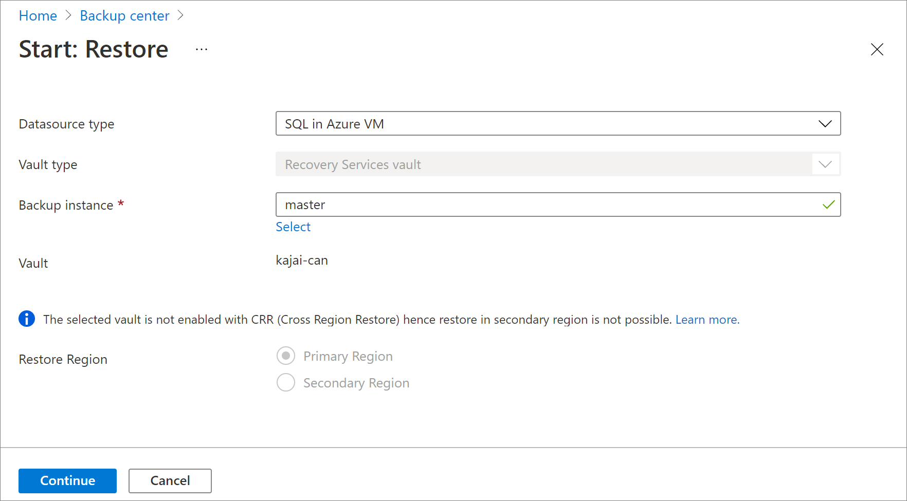 セカンダリ リージョンに復元するユーザー エクスペリエンスは、プライマリ リージョンに復元するユーザー エクスペリエンスに似ています。 [復元の構成] ペインで復元の詳細を構成するときに、セカンダリ リージョンのパラメーターのみを指定するように求められます。 コンテナーがセカンダリ リージョンに存在し、SQL サーバーがセカンダリ リージョンのコンテナーに登録されている必要があります。