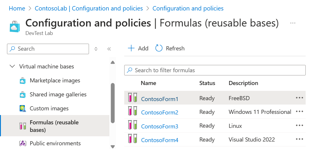 DevTest Labs が数式を作成すると、[数式 (再利用可能なベース)] ページの一覧に表示されます。