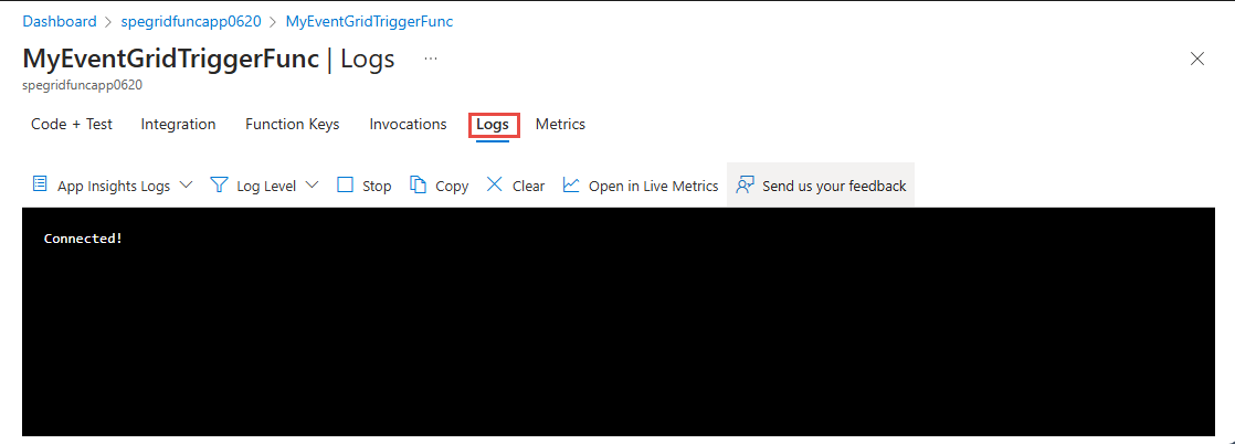 [ ログ ] タブに切り替えます。この記事の後半で Event Grid トピックにイベントを送信するときにログに記録されたメッセージを表示できるように、このタブを開いたままにします。