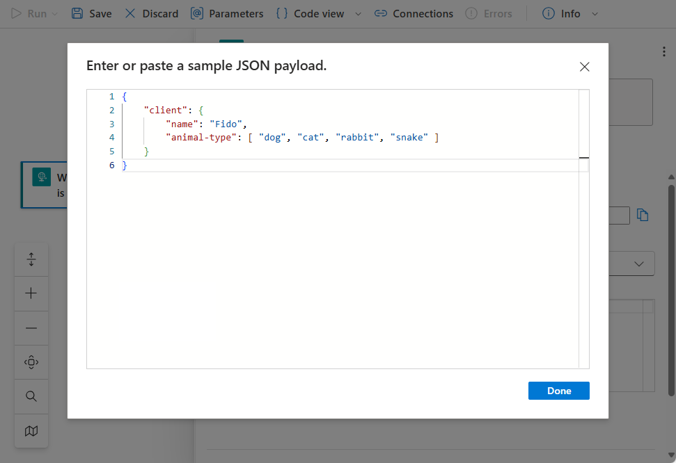 [ サンプル JSON ペイロードの入力または貼り付け ] ボックスにサンプル ペイロードを入力し、[ 完了] を選択します。