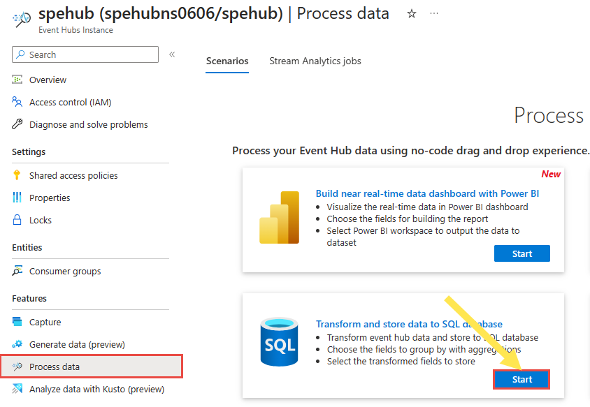 このセクションでは、ノーコード エディターを使用して Azure Stream Analytics ジョブを作成します。 ジョブにより、Event Hubs インスタンス (イベント ハブ) からのデータ ストリーミングが変換され、結果データが Azure SQL データベースに格納されます。