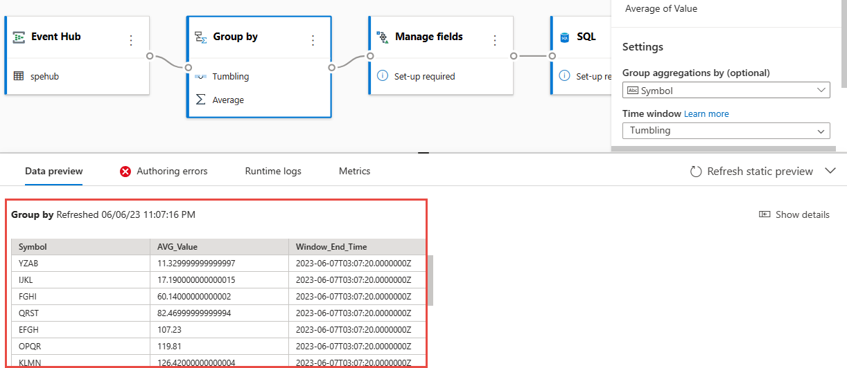 AVG_ValueをValueにします。 選択内容を保存すると、[データ プレビュー] ペインにデータが表示されます。次の例では、[Symbol] と [AVG_Value] が選択されています。 [Symbol] は [シンボル] にマップされ、[AVG_Value] は [価格] にマップされます。