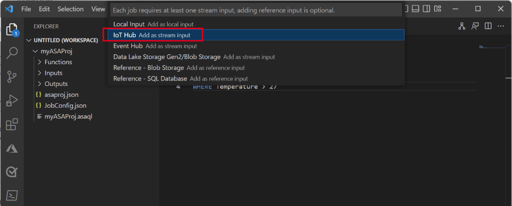 Visual Studio Code によって、ASA プロジェクトがワークスペースに追加されます。 これは、3 つのフォルダー (Inputs、Outputs、Functions) で構成されています。 また、クエリ スクリプト (*.asaql) 、JobConfig.json ファイル、asaproj.json 構成ファイルも含まれます。