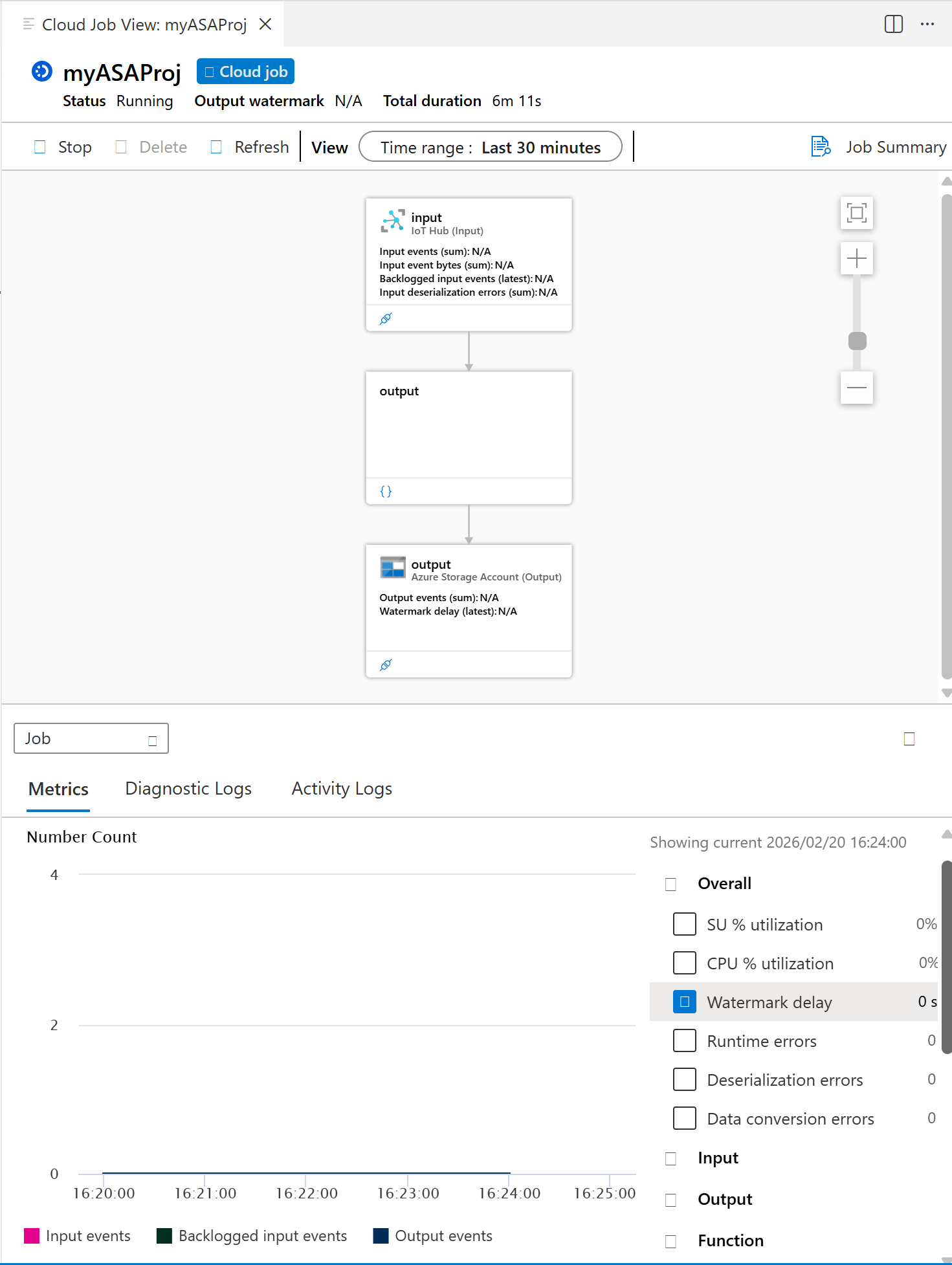 ジョブが正常に開始されると、ジョブの状態が [実行中] に変わります。 ASA ジョブの実行方法を示す論理図が表示されます。