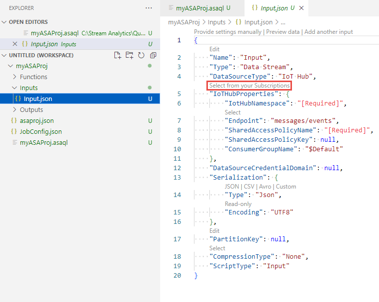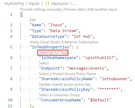 Input.json の JSON エディターで、[Select from your subscriptions]\(サブスクリプションから選択\) を選んで、IoT ハブがある Azure サブスクリプションを選択します。