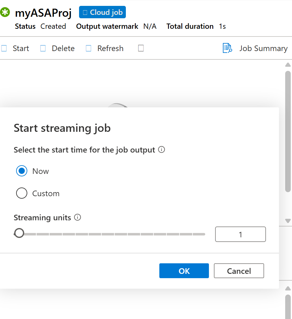 [ストリーミング ジョブの開始] ウィンドウで、[OK] を選択します。 このプロセスが完了するには数分かかることがあります。