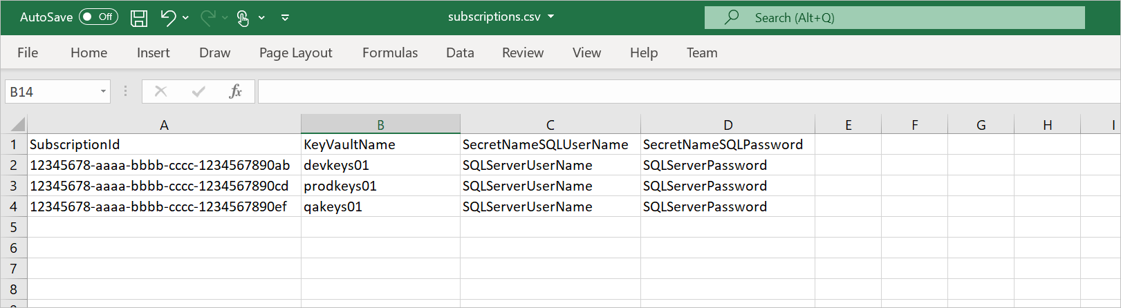スクリプトを実行する前に、次の 4 つの列を含む .csv ファイル (C:\temp\Subscriptions.csv など) を作成します。