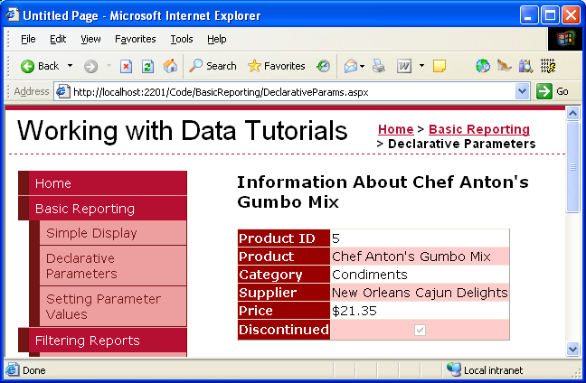 このチュートリアルでは、まず、ハードコーディングされた値に設定されたパラメーターを使用する方法について説明します。 具体的には、DetailsView を特定の製品 (つまり、Chef Anton's Gumbo Mix) に関する情報を表示するページに追加する方法を説明していきます。この製品の ProductID は 5 です。 次に、Web コントロールに基づいてパラメーター値を設定する方法についてみていきます。 特に、TextBox を使用してユーザーが国/地域を入力できるようにします。その後、ボタンをクリックすると、その国/地域内に存在するサプライヤーの一覧を表示できます。