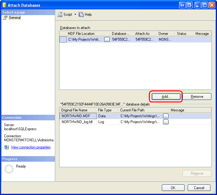 サーバーに接続すると、Management Studio によってサーバーが表示され、データベースやセキュリティなどのサブフォルダーが表示されます。 [データベース] フォルダーを右クリックし、[アタッチ] オプションを選択します。 [データベースのアタッチ] ダイアログ ボックスが表示されます (図 2 を参照)。 [追加] ボタンをクリックし、Web アプリケーションの NORTHWND.MDF フォルダー内の App_Data データベース フォルダーを選択します。