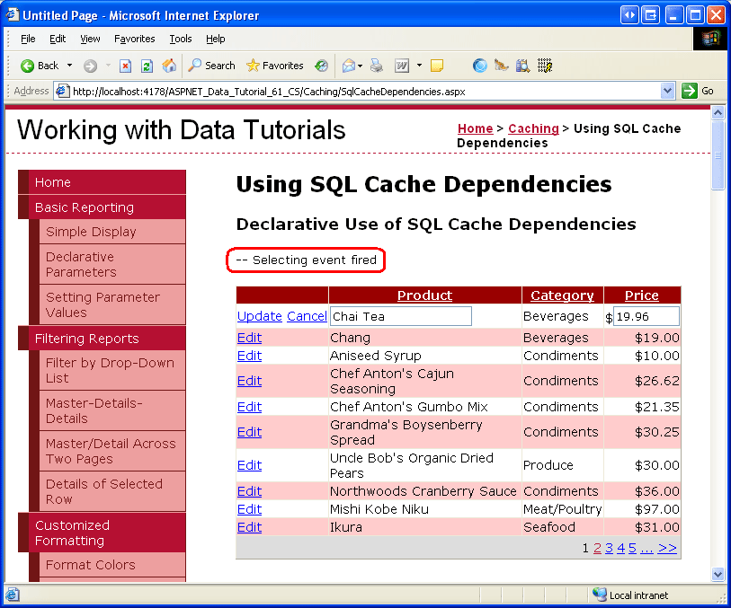 グリッドをページングし、[Selecting event fired text]\(イベントが発生したテキストの選択\) が表示されていないことに気が付いた後、新しいブラウザー ウィンドウを開き、[編集]、[挿入]、[削除] セクションの [基本] チュートリアル (~/EditInsertDelete/Basics.aspx) に移動します。 製品の名前または価格を更新します。 次に、最初のブラウザー ウィンドウから別のページのデータを表示するか、グリッドを並べ替えるか、行の [編集] ボタンをクリックします。 今回は、基になるデータベース データが変更されたため、"発生したイベントの選択" が再び表示されます (図 10 を参照)。 テキストが表示されない場合は、しばらく待ってからやり直してください。 ポーリング サービスでは、Products ミリ秒ごとにpollTime テーブルへの変更がチェックされるため、基になるデータが更新されてからキャッシュされたデータが削除されるまでに遅延が発生します。