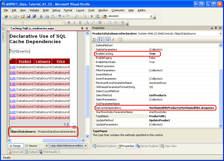 SQL キャッシュの依存関係 と 時間ベースの有効期限を使用するには、 EnableCaching を Trueに設定し、時間間隔に CacheDuration し、データベースとテーブル名に SqlCacheDependency します。 ObjectDataSource は、時間ベースの有効期限に達したとき、またはポーリング システムが基になるデータベース データが変更されたことに注意した場合(どちらか早い方)、データを削除します。
