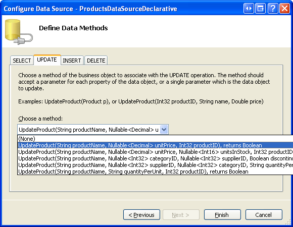 ProductsBLL クラスを使用するように ObjectDataSource を構成し、[SELECT] タブのドロップダウン リストをGetProducts()に設定します。 [UPDATE] タブで、UpdateProduct、productName、unitPriceの 3 つの入力パラメーターを持つproductID オーバーロードを選択します。 [挿入] タブと [DELETE] タブでドロップダウン リストを (なし) に設定します。
