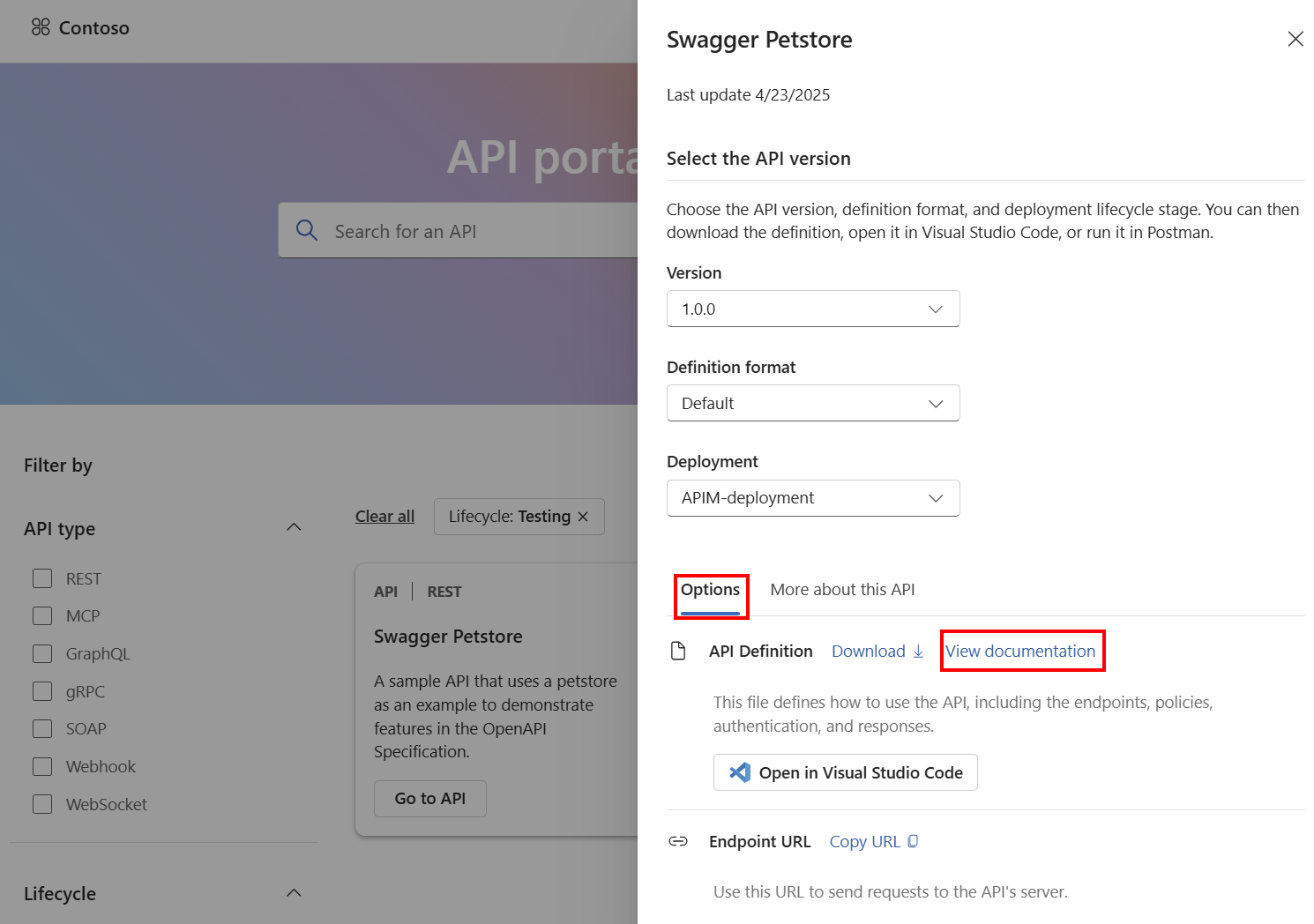 [API センター ポータル] で、[ポータルの設定]>[API センター ポータルの表示] を選択します。
