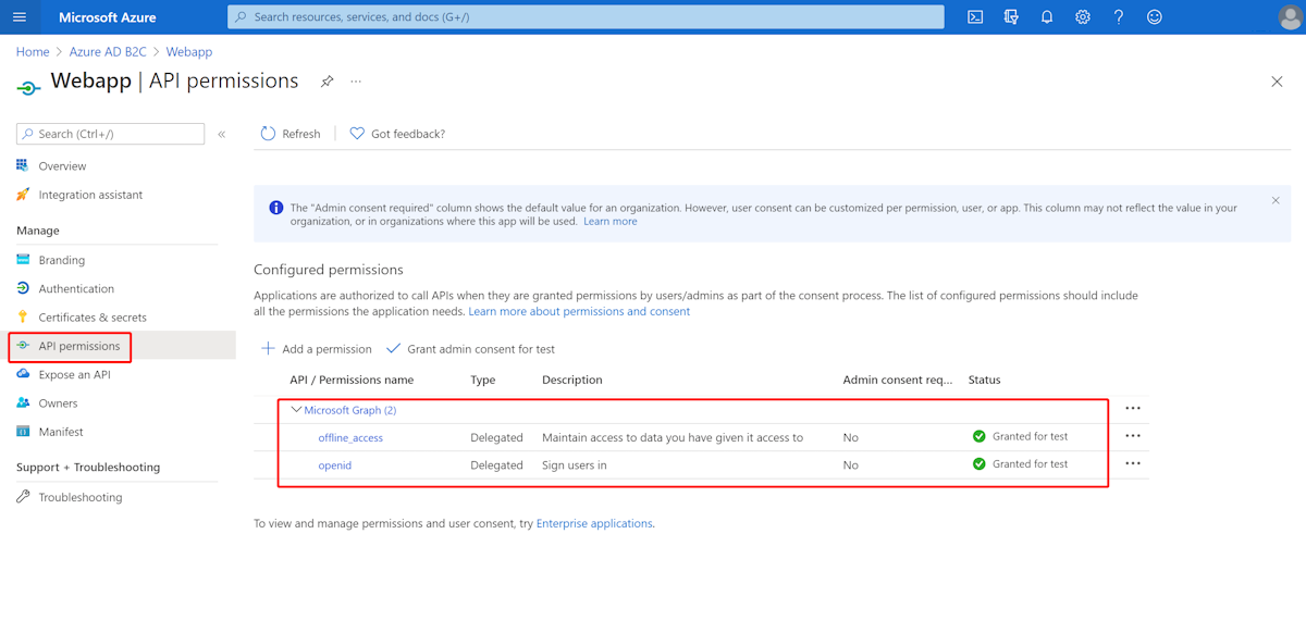 WebApiA アクセス許可を追加し、Web アプリケーションの管理者の同意を付与します。