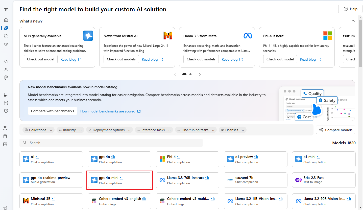 モデルの一覧から gpt-4o-mini モデルを選択します。 検索バーを使用して見つけることができます。