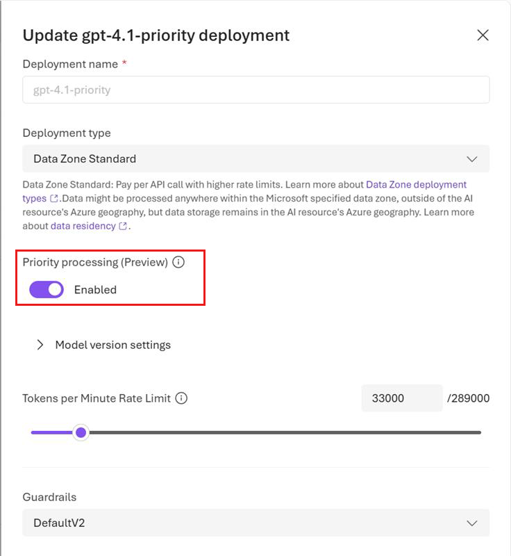 Microsoft Foundry ポータルでは、デプロイのセットアップ中に優先度の処理を有効にすることができます。 デプロイの作成時にデプロイの詳細ページで [優先順位の処理 (プレビュー)] トグルをオンにするか、デプロイの詳細を編集してデプロイされたモデルの設定を更新します。
