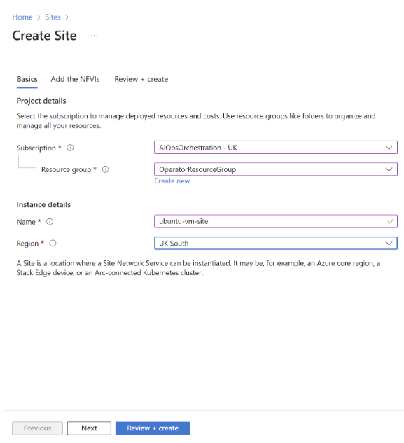 Setting 価値 Subscription [サブスクリプション] を選択します。 リソース グループ OperatorResourceGroup を選択します。 名前 「ubuntu-vm-site」と入力します。 この名前は、後で SNS を作成するときに混乱を避けるために、サブスクリプション内で一意である必要があります。 リージョン 前提条件リソースに使用した場所を選択します。