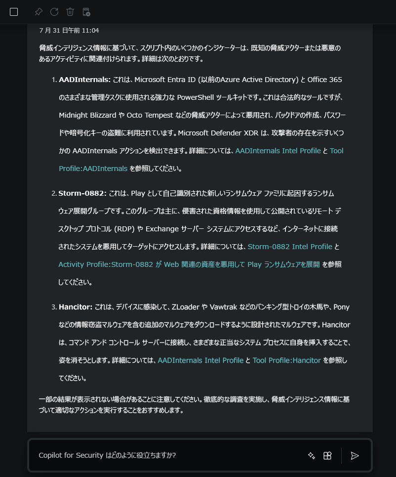 このユース ケースでは、Security Copilotがインシデントの徹底的な調査を行うのに役立ちました。 アナリストは自然言語を使用して、疑わしいスクリプトの実行内容の説明を取得し、スクリプト内のインジケーターが既知の脅威アクターに関連付けられていることを確認できます。