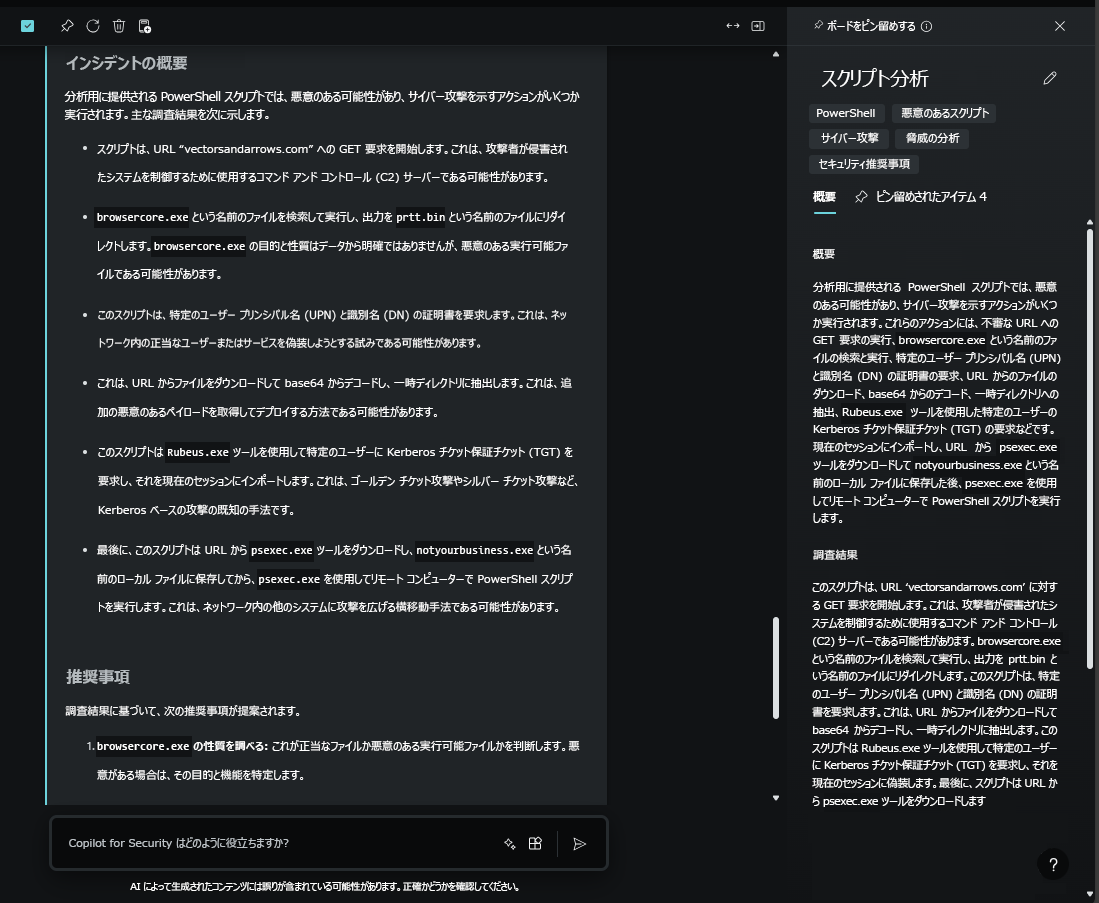 さらに、Security Copilot概要レポートを通じて評価を生成し、インシデントを含めるための一連の推奨事項を提供しました。これは、スキルの向上にも使用できます。
