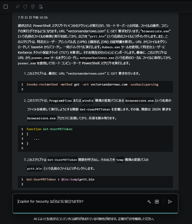 インシデントをより包括的に理解するには、Security Copilotを使用して、コマンド ライン スクリプトに表示される不審なアクティビティに関する詳細情報を収集します。