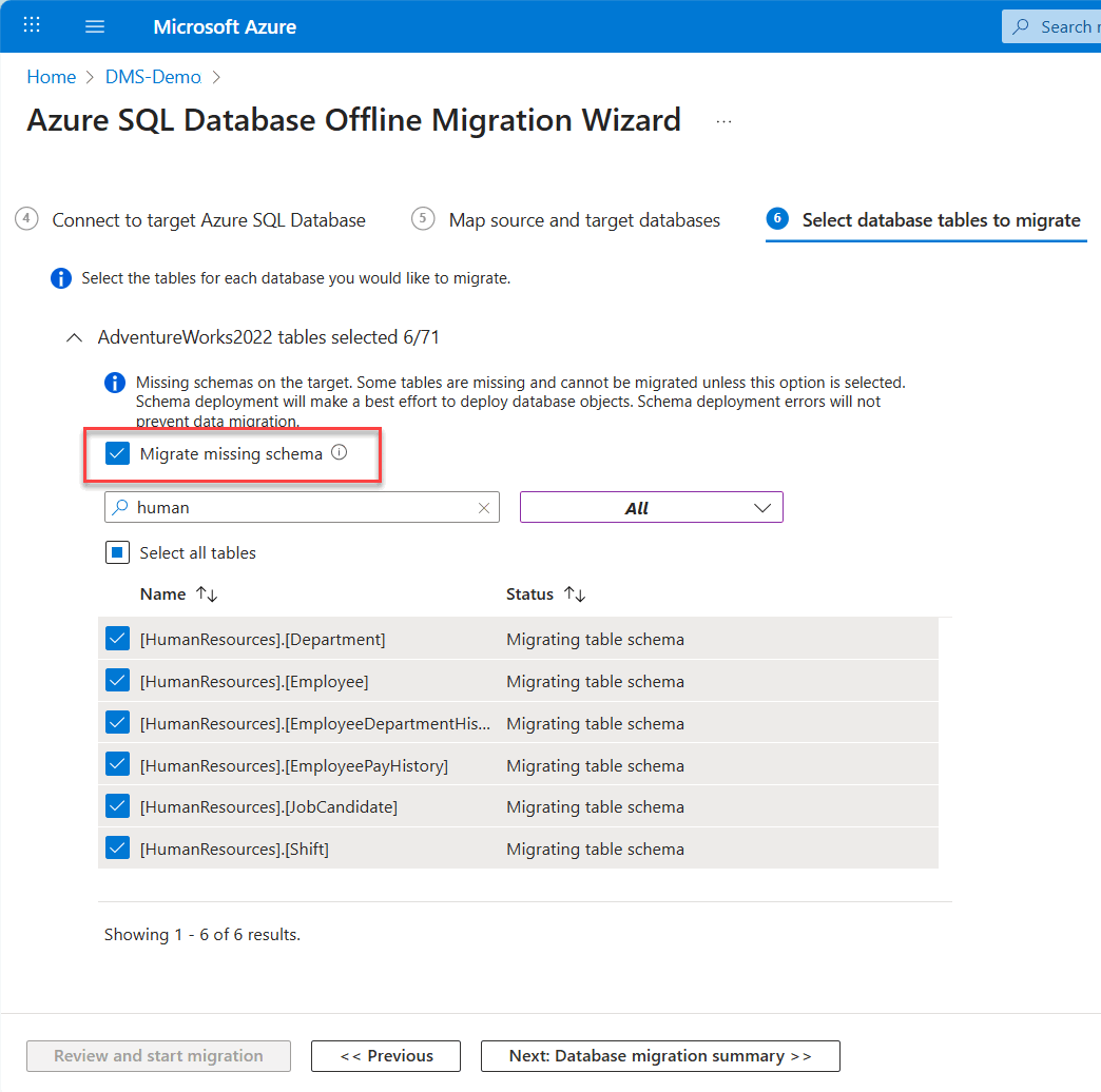 (省略可能)[ 不足しているスキーマの移行 ] の横にあるチェック ボックスをオンにして、不足しているスキーマ オブジェクトをソースから Azure SQL Database ターゲットにデプロイし、次のスキーマ オブジェクトを 1 つのチェック ボックスで移行します。