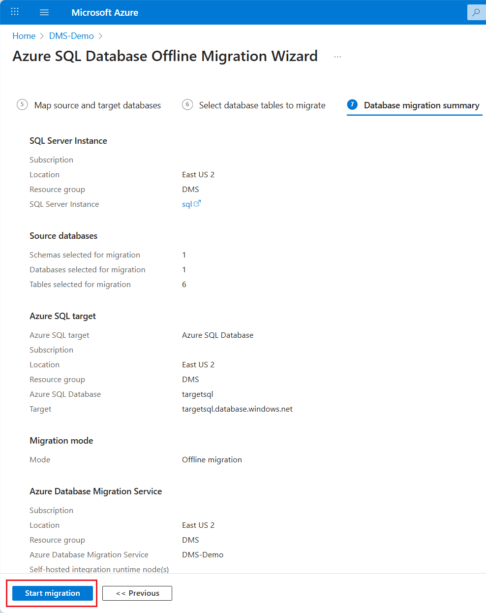 [ データベース移行の概要 ] タブで詳細を確認し、[ 移行の開始] を選択します。これにより、データベースの移行が開始され、データベース移行サービス ダッシュボードに自動的に戻ります。