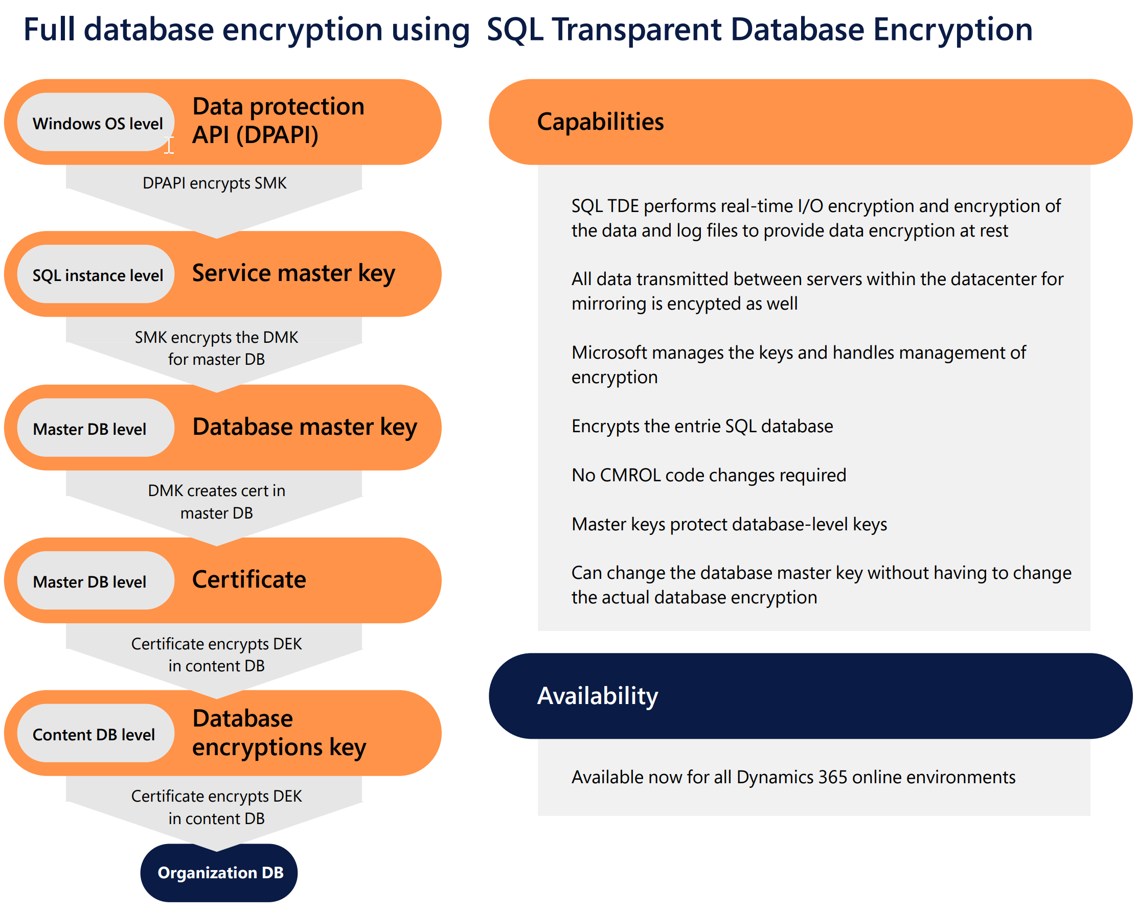 At a minimum, Dynamics 365 environment databases use SQL TDE (Transparent Data Encryption, compliant with FIPS 140-2) to encrypt and decrypt the data and log files in real time. This provides data encryption at rest.