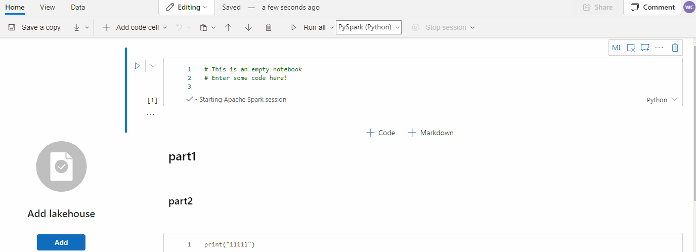 Jupyter Notebook と同様に、Fabric ノートブックではモーダル ユーザー インターフェイスが採用されています。 キーボードの動作は、ノートブック セルのモードによって異なります。 Fanric ノートブックでは、特定のコード セルに対して、コマンド モードと編集モードという 2 つのモードがサポートされます。