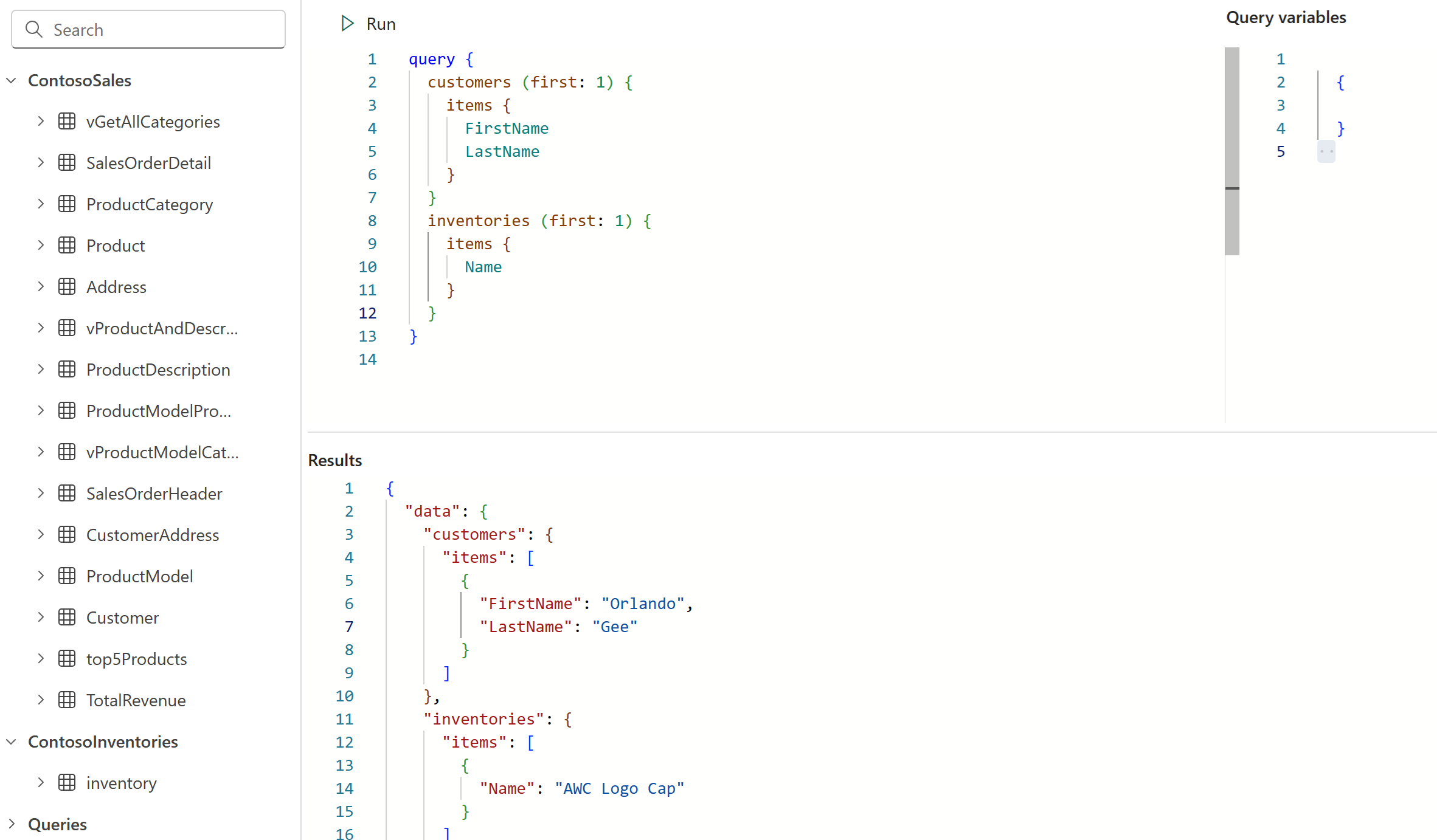 customers項目にはFirstNameやLastNameなどのプロパティが含まれますが、inventories項目にはクエリで要求されたとおりに、Nameなどのプロパティがあります。